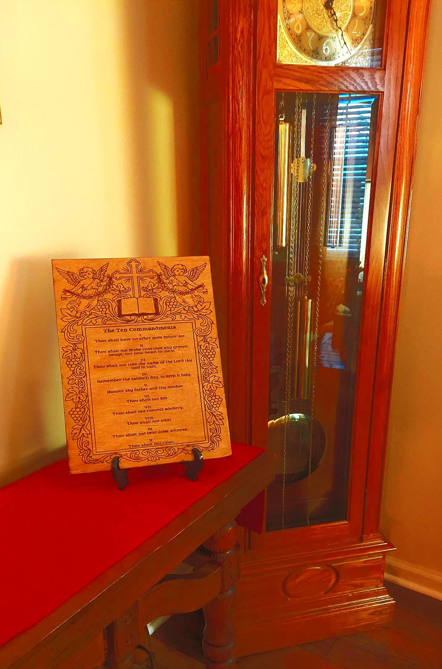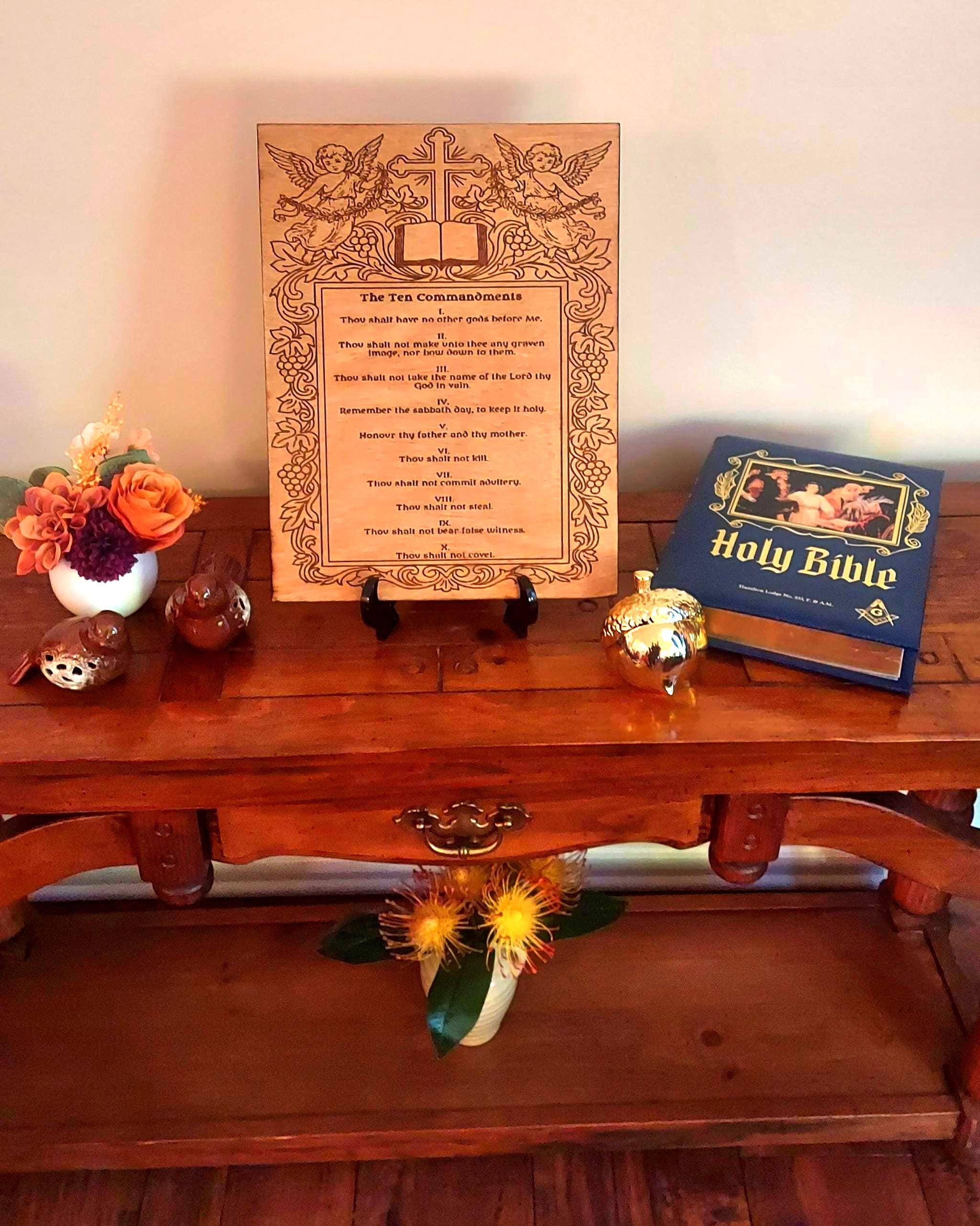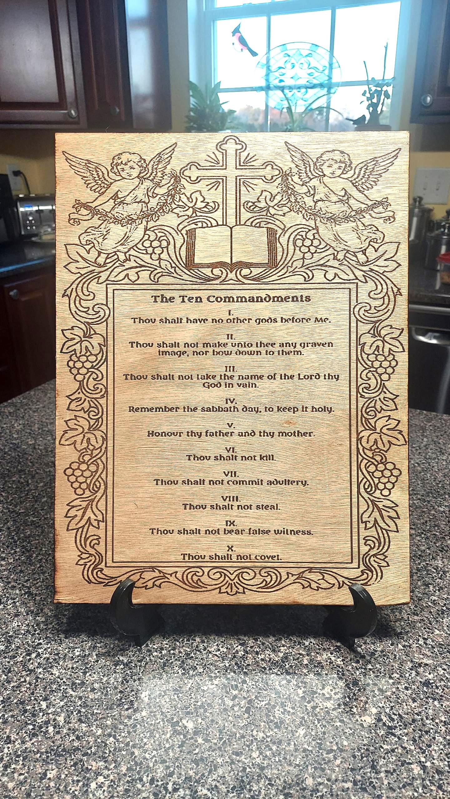 Bring timeless faith and Scripture into your home with this beautifully crafted Laser Engraved Ten Commandments Display. Each piece is engraved on premium wood and features intricate angel artwork, a cross, and a detailed frame design. The plaque is then flame-sealed for a rich, darkened edge and coated with a protective poly finish to ensure lifelong durability.