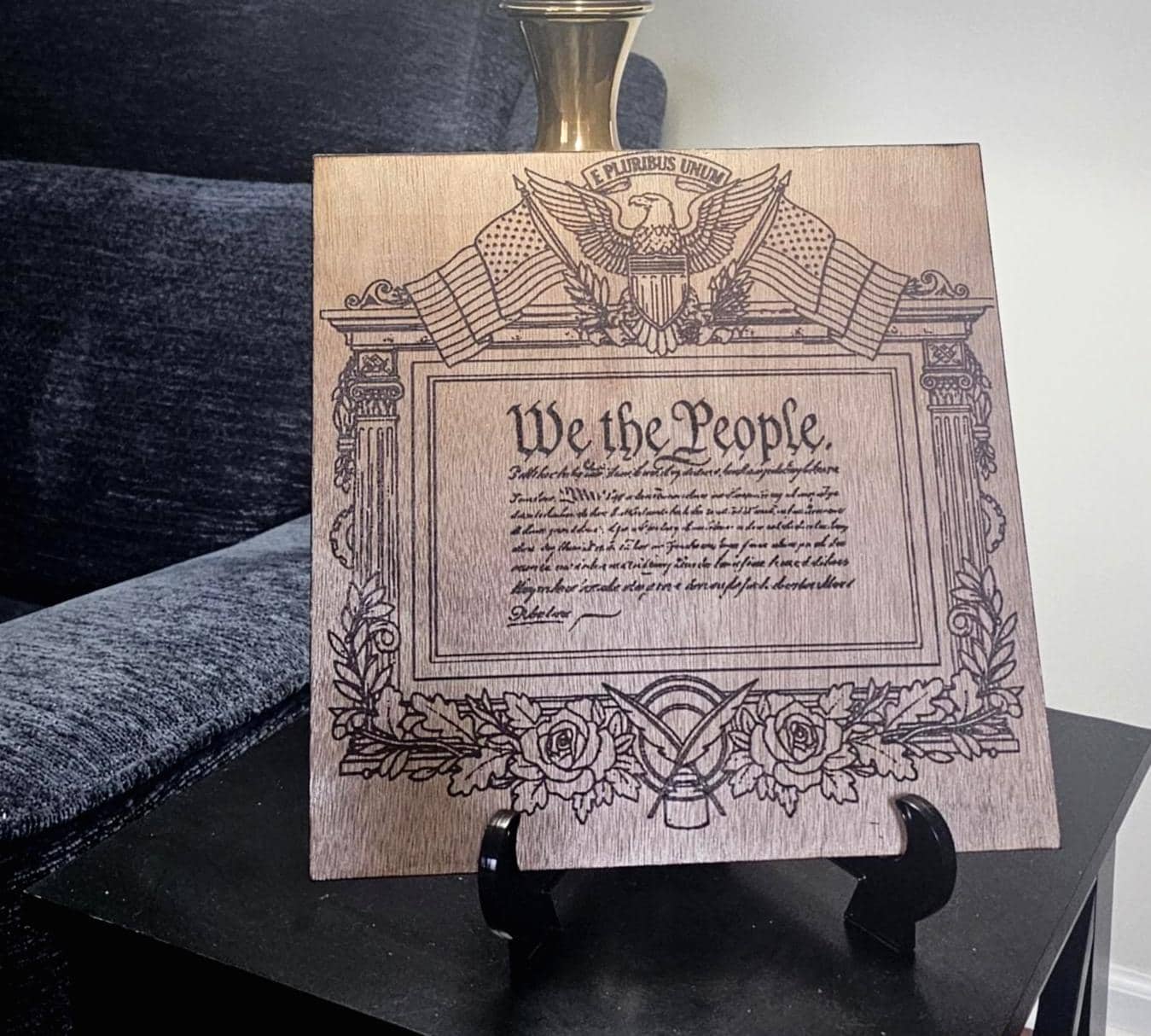 Celebrate American history and freedom with this stunning, laser-engraved wooden plaque featuring the complete Preamble to the U.S. Constitution. The intricate design includes the iconic "We the People" framed by decorative columns, the national eagle crest, and patriotic floral elements.